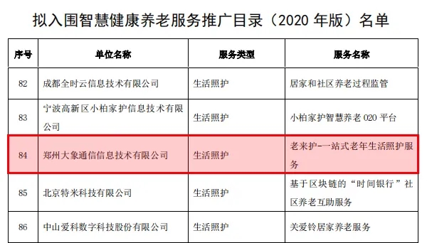 鄭州大象通信信息技術有限公司的老來護-一站式老年生活照護服務順利入圍《智慧健康養老產品及服務推廣目錄(2020年版)》。